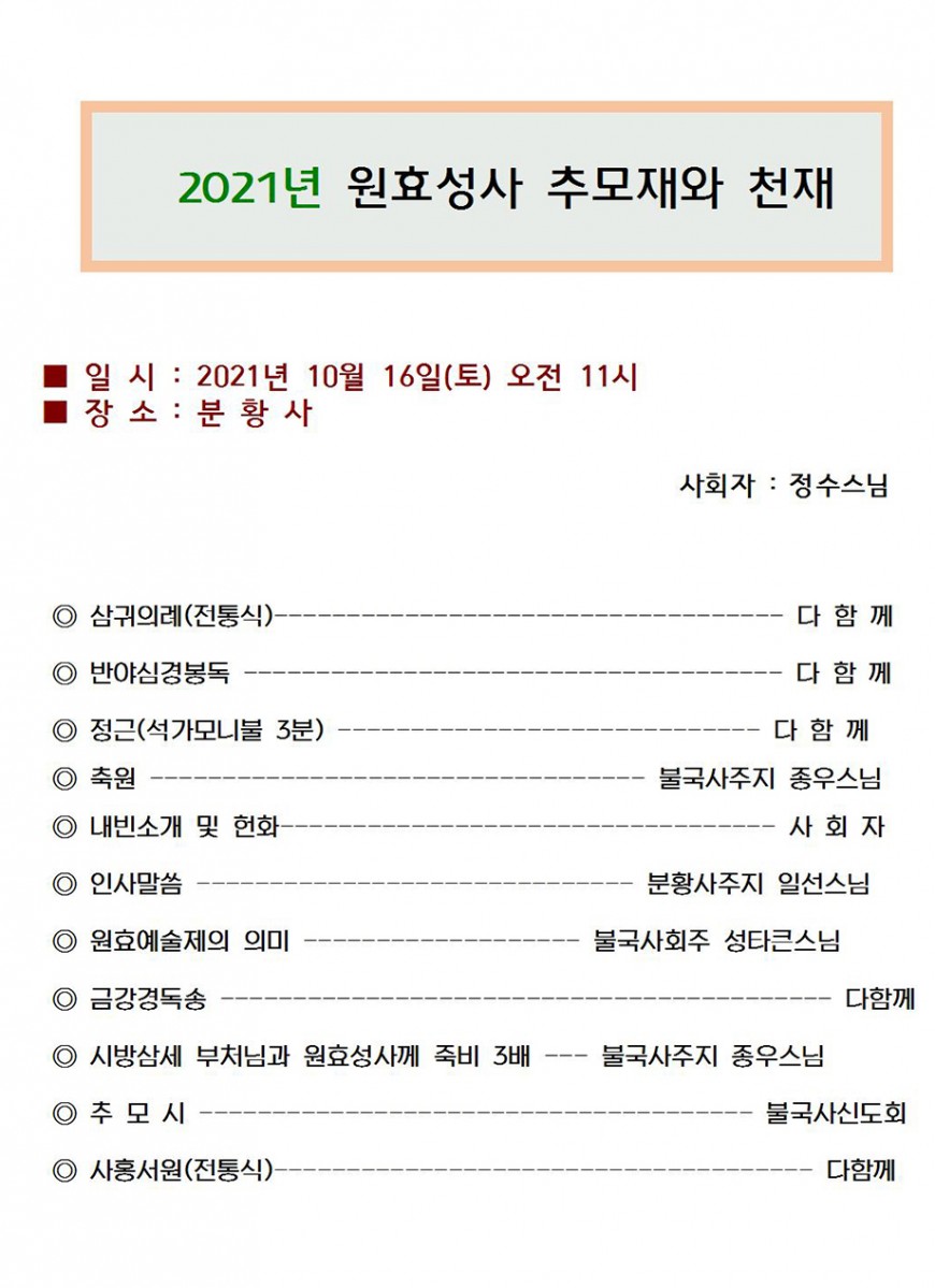 2021년 원효성사 추모재와 천재 페이지 정보 작성자 최고관리자 댓글 0건 조회 9,798회 작성일 21-10-14 09:53 본문 . 목록 이전글2022년 원효성사 제향대재 22.04.25 다음글불기 2563년 원효예술제 19.10.01 댓글목록 댓글목록 등록된 댓글이 없습니다.